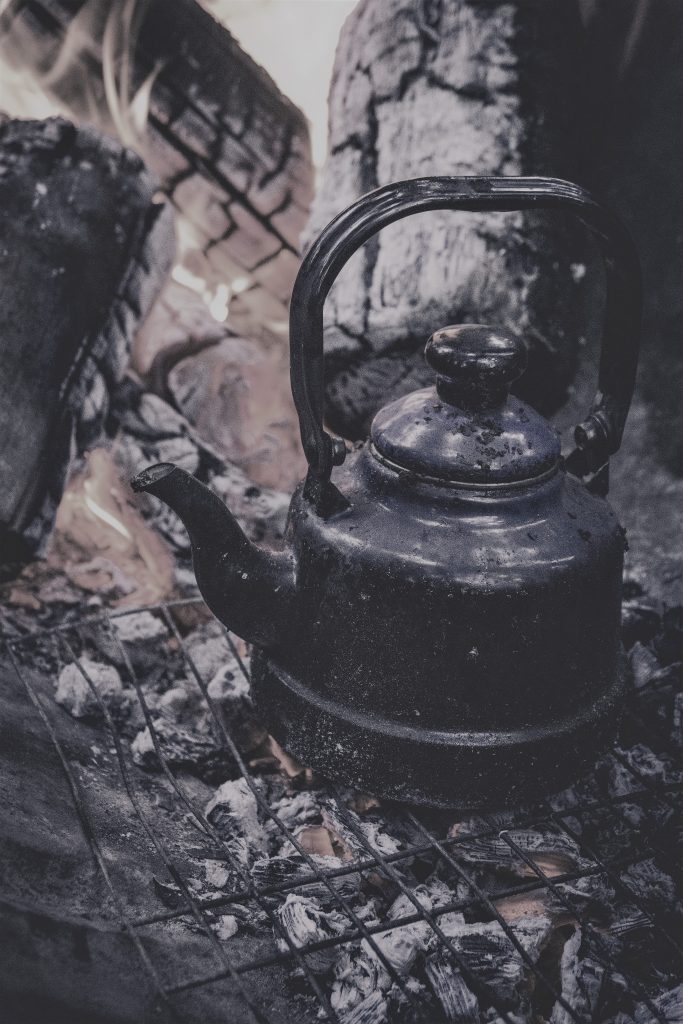 Während ich neben dem größer werdenden Feuer hocke und meine noch klammen Finger wärme, fällt mein Blick auf die große, rußverschmierte Kaffeekanne, in der wir schon gestern unseren Frühstückskaffee zubereitet haben.